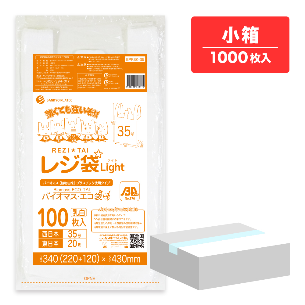 バイオマスプラスチック 25%配合 レジ袋 薄手 西日本 35号 (東日本20号) ブロック有 乳白 0.011mm厚 100枚x10冊 BPRSK-35kobako /手さげ袋 買い物袋 袋 M 業務用