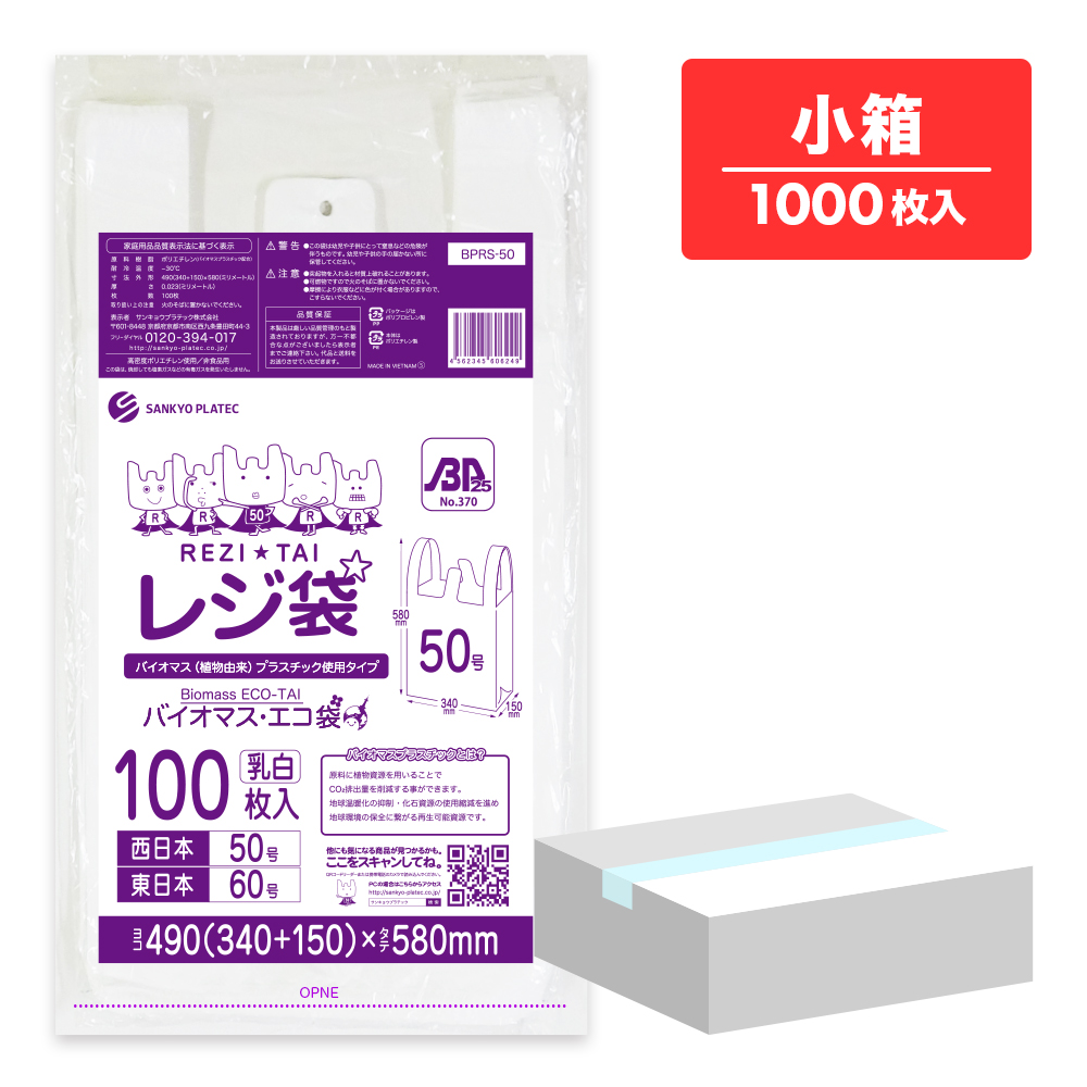 バイオマスプラスチック 25%配合 レジ袋 薄手 西日本 50号 (東日本60号) ブロック有 半透明 0.018mm厚 100枚x10冊 BPRHK-50kobako /手さげ袋 買い物袋 袋 3L 業務用