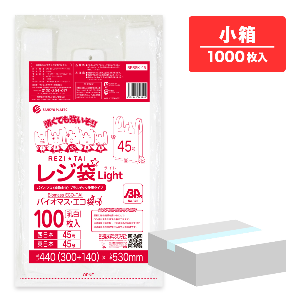 バイオマスプラスチック 25%配合 レジ袋 薄手 西日本 45号 (東日本45号) ブロック有 乳白 0.016mm厚 100枚x10冊 BPRSK-45kobako /手さげ袋 買い物袋 袋 LL 業務用