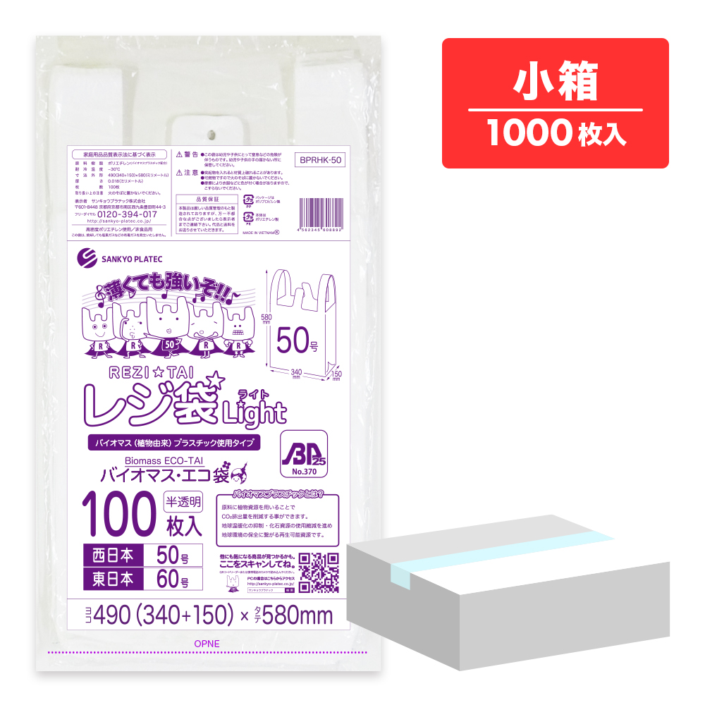 バイオマスプラスチック 25%配合 レジ袋 薄手 西日本 50号 (東日本60号) ブロック有 半透明 0.018mm厚 100枚x10冊 BPRHK-50kobako /手さげ袋 買い物袋 袋 3L 業務用