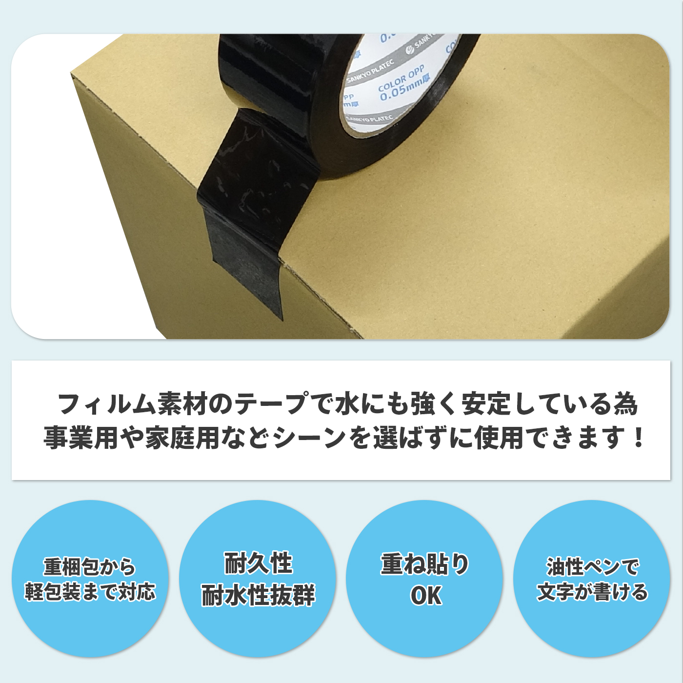 フィルム素材のテープで耐久性・耐水性も抜群で、事業用や家庭用などシーンを選ばすに使用できます。