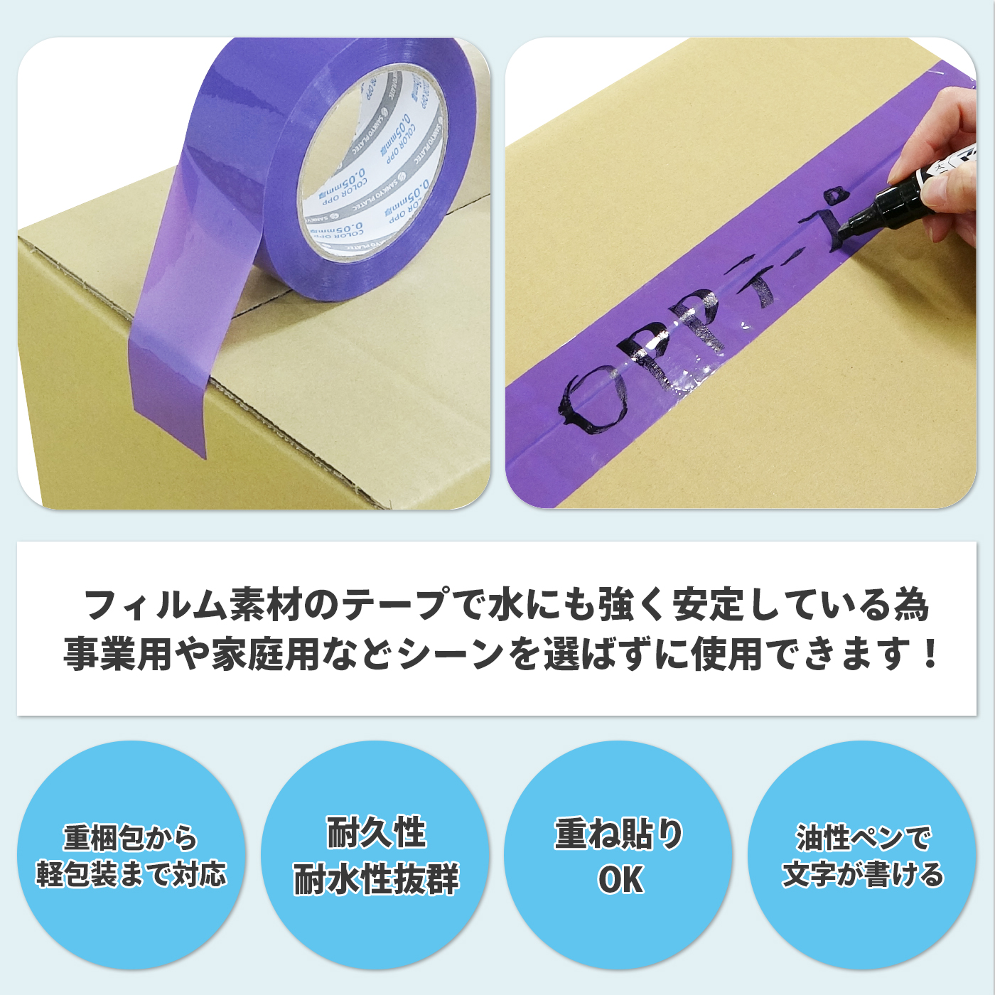 フィルム素材のテープで耐久性・耐水性も抜群で、事業用や家庭用などシーンを選ばすに使用できます。