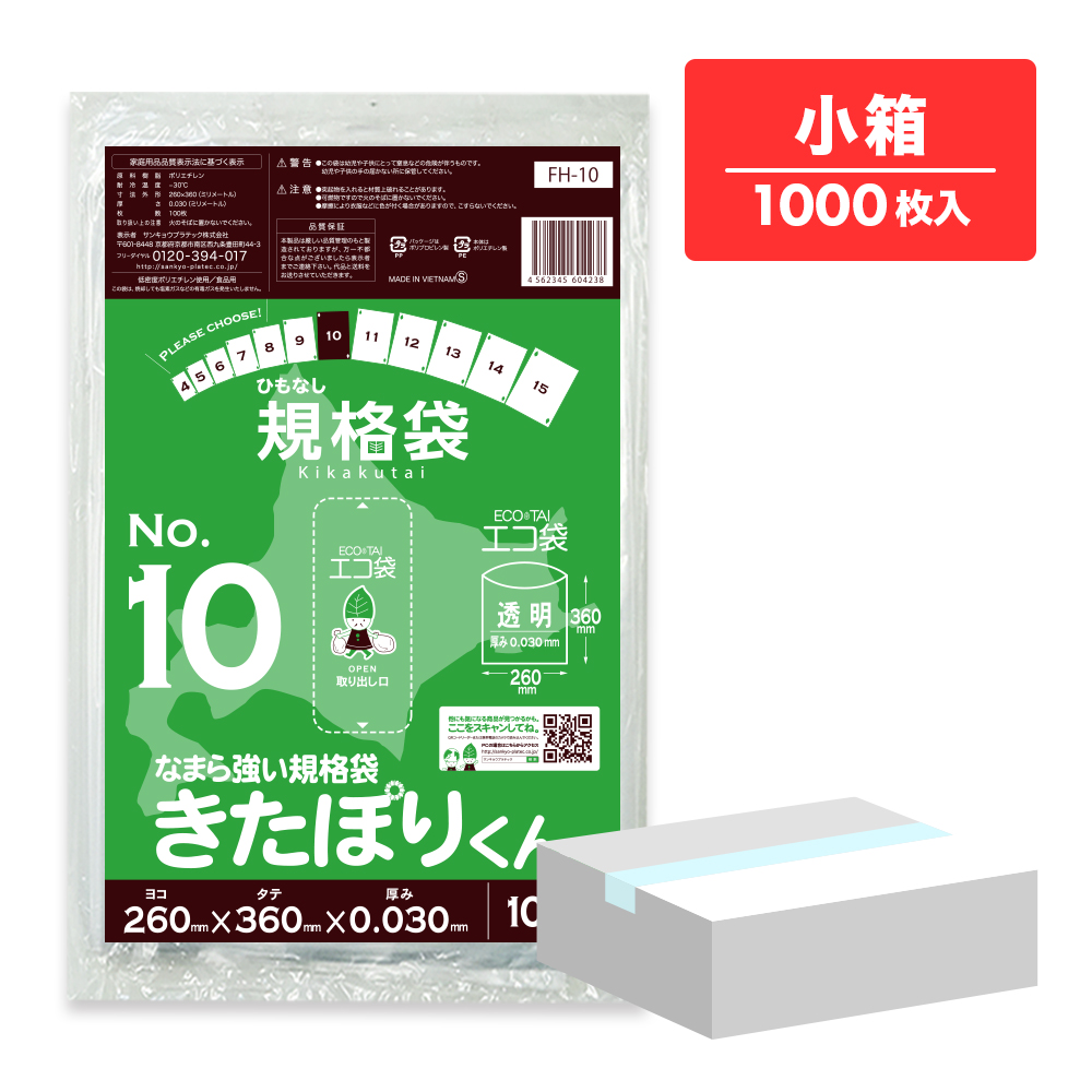 FH-10kobako きたぽりくん 北海道規格 ひもなし 規格袋 10号 0.030mm厚 透明 100枚×10冊