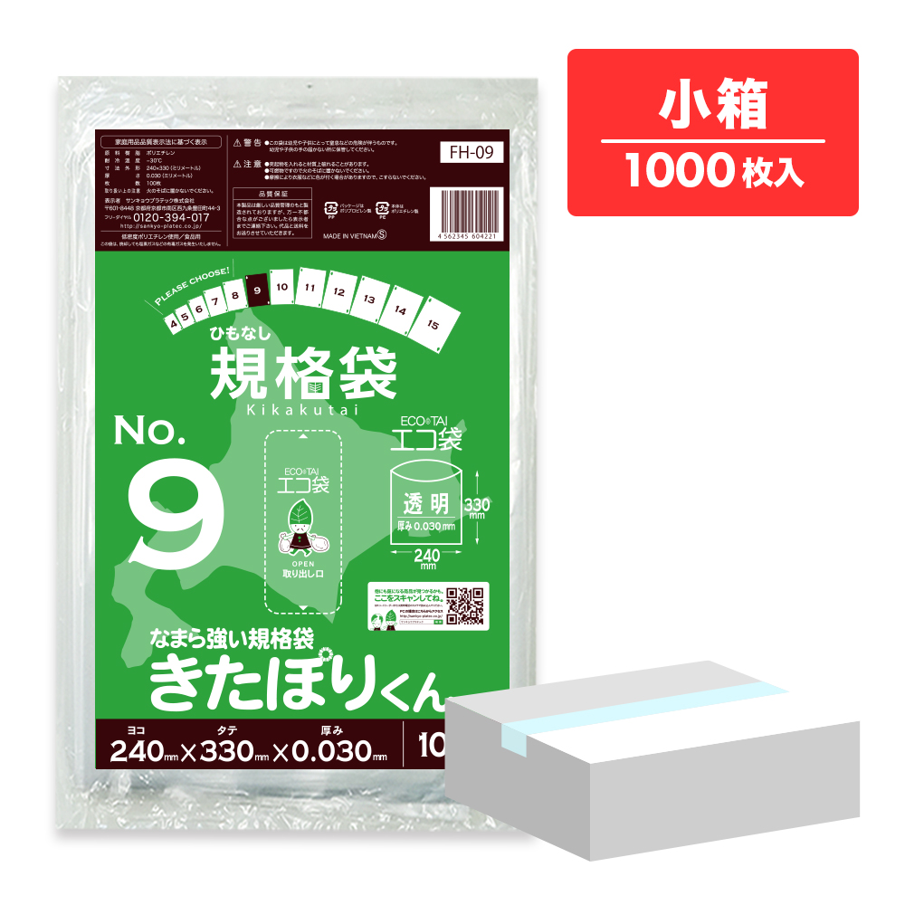 FH-09kobako きたぽりくん 北海道規格 ひもなし 規格袋 9号 0.030mm厚 透明 100枚×10冊