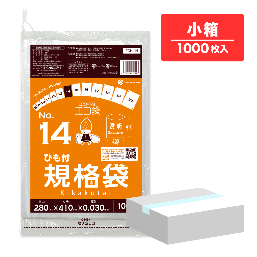 ひも付 規格袋 14号 透明 28x41cm 0.030mm厚 100枚x10冊 FCH-14kobako 食品検査適合 食品対応 袋 保存袋 食品用 検食 仕分け 梱包 No.14 クリア 業務用