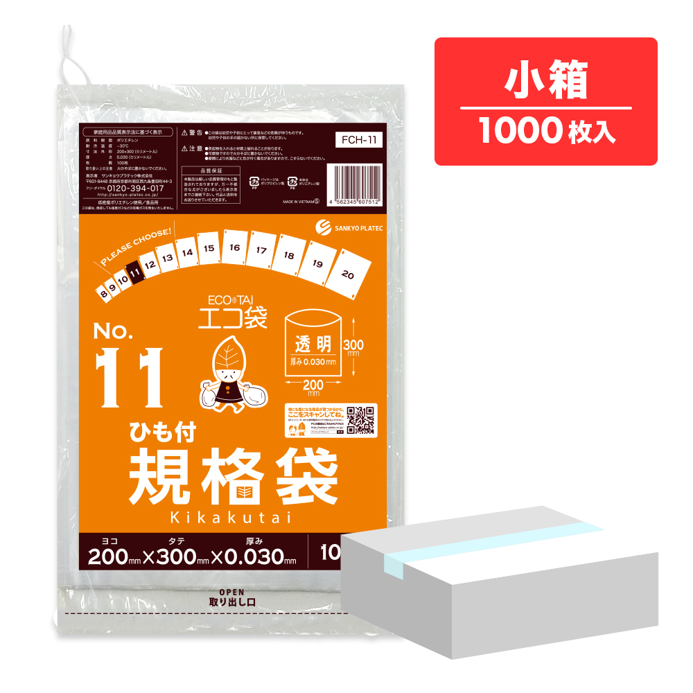 ひも付 規格袋 11号 透明 20x30cm 0.030mm厚 100枚x10冊 FCH-11kobako 食品検査適合 食品対応 袋 保存袋 食品用 検食 仕分け 梱包 No.11 クリア 業務用