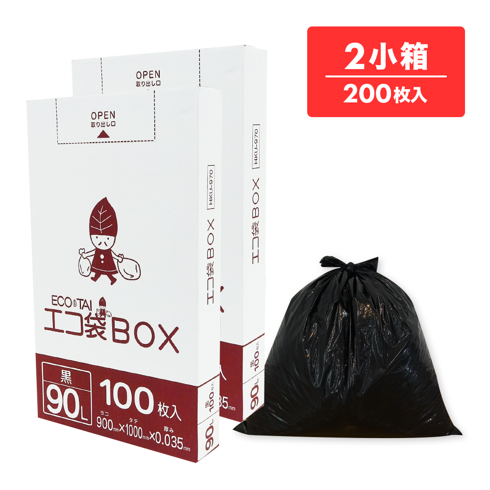 ごみ袋 箱タイプ 90リットル 薄手 黒 90x100cm 0.035mm厚 100枚x2小箱 HKU-970-2kobako ポリ袋 ゴミ袋 平袋 BOX 90l ブラック 業務用