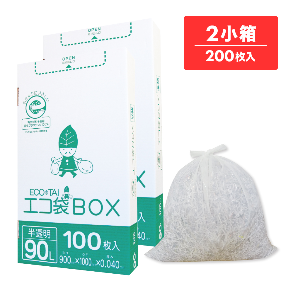 ごみ袋 箱タイプ 90リットル 半透明 90x100cm 0.040mm厚 100枚x2小箱 HK-940-2kobako / 業務用 ポリ袋 ゴミ袋 平袋 BOX 90l ホワイト