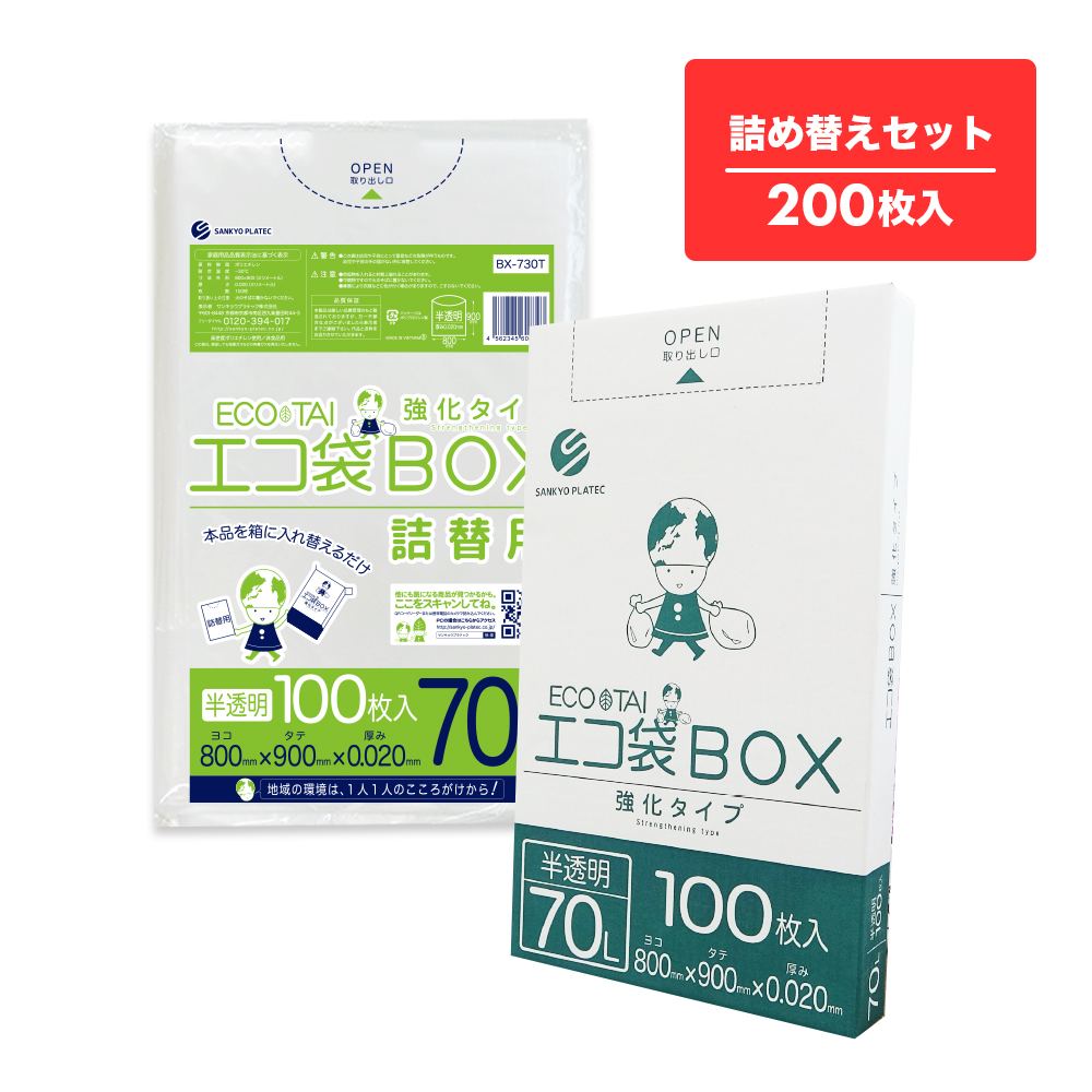 ごみ袋 70リットル 薄手 半透明 80x90cm 0.020mm厚 1小箱(100枚)+詰替用(100枚) BX-730kt / ポリ袋 ゴミ袋 箱タイプ 70l ナチュラル 業務用