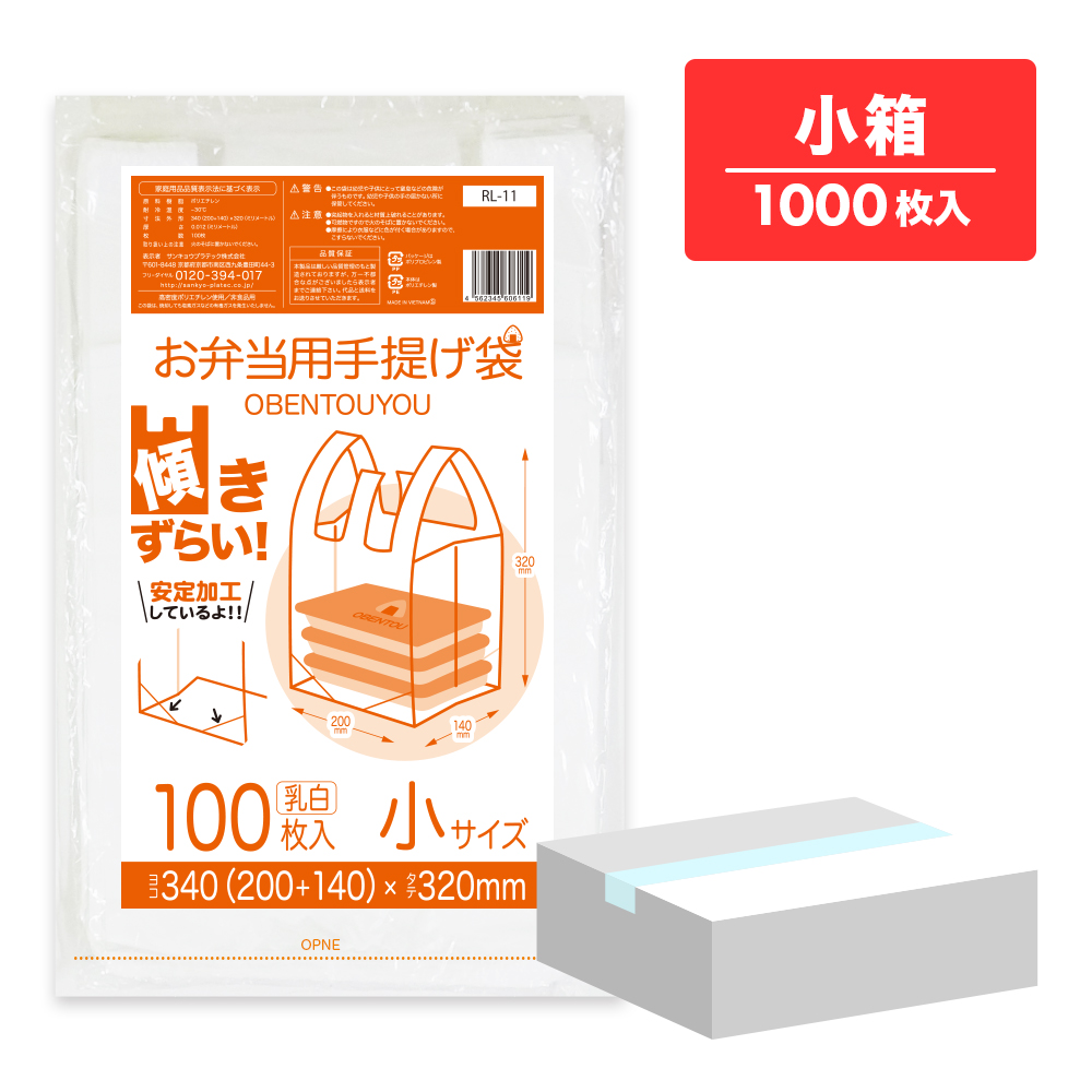 傾きづらい お弁当用手提げ袋 小サイズ 乳白 0.012mm厚 100枚x10冊 RL-11kobako ブロック有 /手さげ袋 買い物袋 袋 持ち帰り用袋 テイクアウト ホワイト 業務用