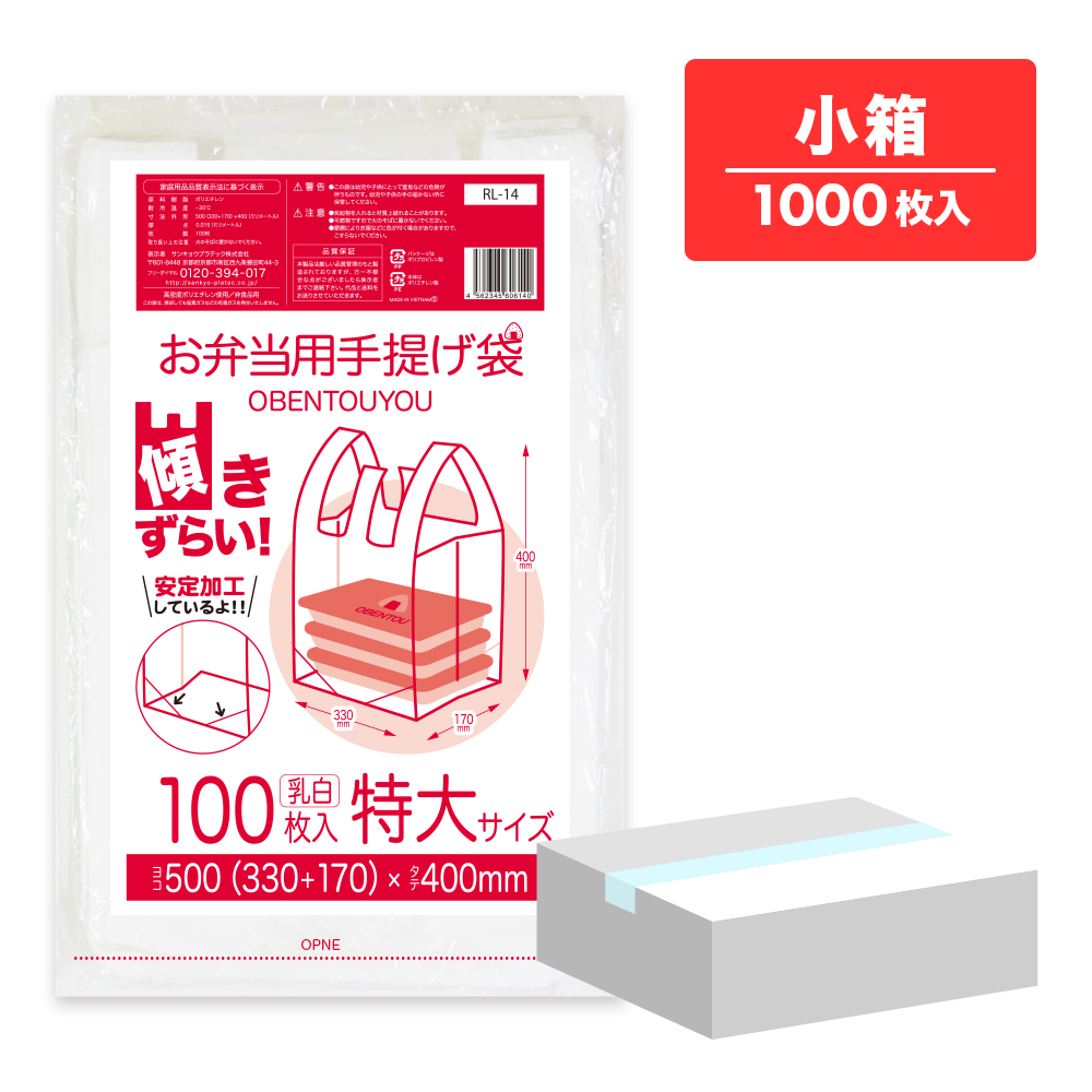 傾きづらい お弁当用手提げ袋 特大サイズ 乳白 0.015mm厚 100枚x10冊 RL-14kobako ブロック有 /手さげ袋 買い物袋 袋 持ち帰り用袋 テイクアウト ホワイト 業務用