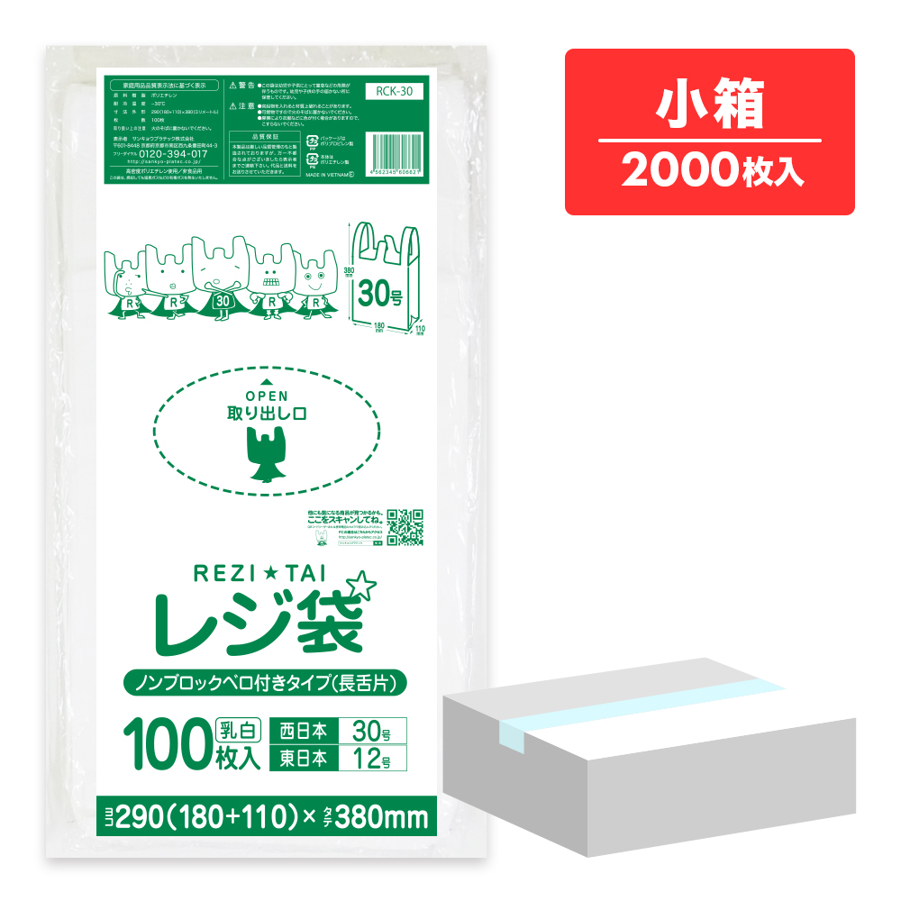 レジ袋 薄手 長舌片タイプ 西日本 30号 (東日本12号) ブロック無 乳白 0.011mm厚 100枚x20冊 RCK-30kobako /手さげ袋 買い物袋 袋 S ホワイト 業務用