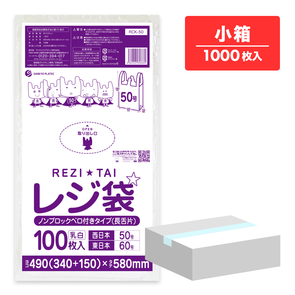 レジ袋 薄手 長舌片タイプ 西日本 50号 (東日本60号) ブロック無 乳白 0.018mm厚 100枚x10冊 RCK-50kobako /手さげ袋 買い物袋 袋 3L ホワイト 業務用