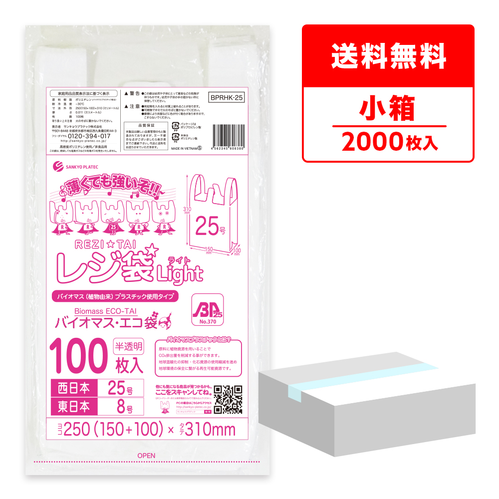 バイオマスプラスチック 25%配合 レジ袋 薄手 西日本 25号 (東日本8号) ブロック有 半透明 0.011mm厚 100枚x20冊 BPRHK-25kobako /手さげ袋 買い物袋 袋 SS 業務用 送料無料