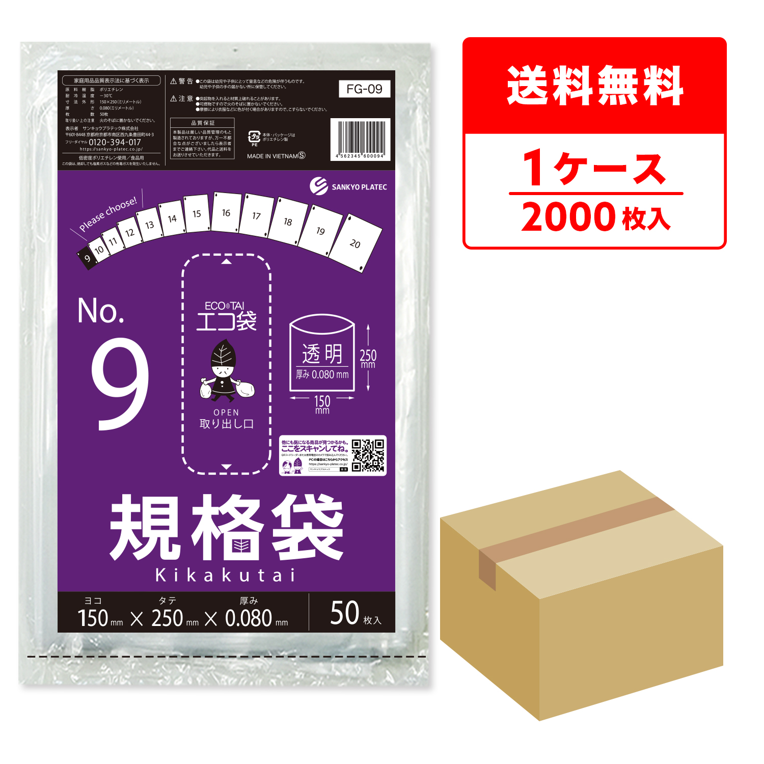 規格袋 9号 極厚 透明 15x25cm 0.080mm厚 50枚x40冊 FG-09 食品検査適合 食品対応 袋 保存袋 食品用 検食 厨房 保育園 仕分け 梱包 保管 工場 No.9 クリア 業務用 送料無料