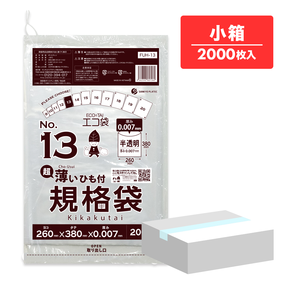 ひも付 規格袋 13号 薄手 半透明 26x38cm 0.007mm厚 200枚x10冊 FUH-13kobako /食品検査適合 食品対応 袋 保存袋 検食用 仕分け 業務用