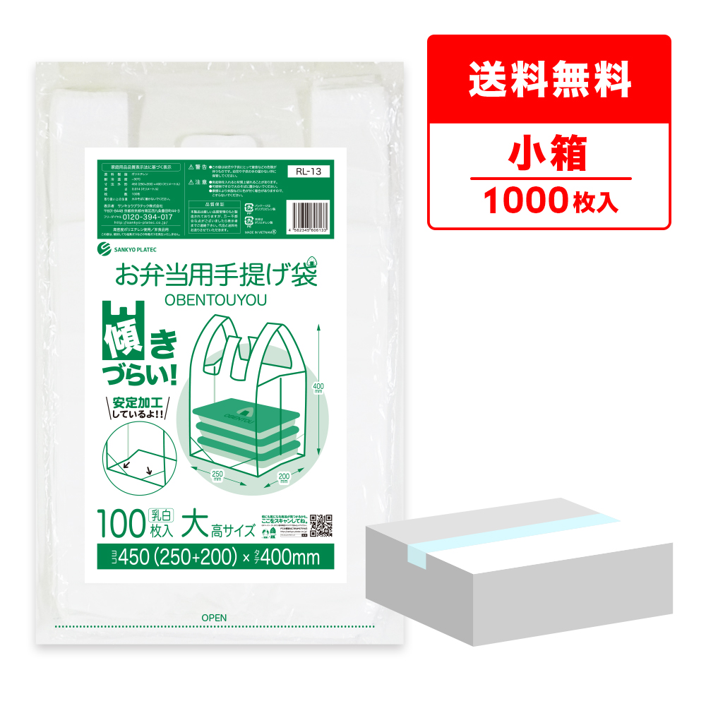 傾きづらい お弁当用手提げ袋 大高サイズ 乳白 0.014mm厚 100枚x10冊 RL-13kobako ブロック有 /手さげ袋 買い物袋 袋 持ち帰り用袋 テイクアウト ホワイト 業務用 送料無料