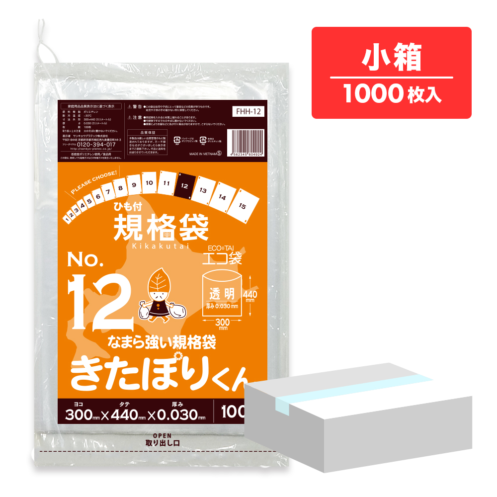 FHH-12kobako きたぽりくん 北海道規格 ひも付 規格袋 12号 0.030mm厚 透明 100枚×10冊