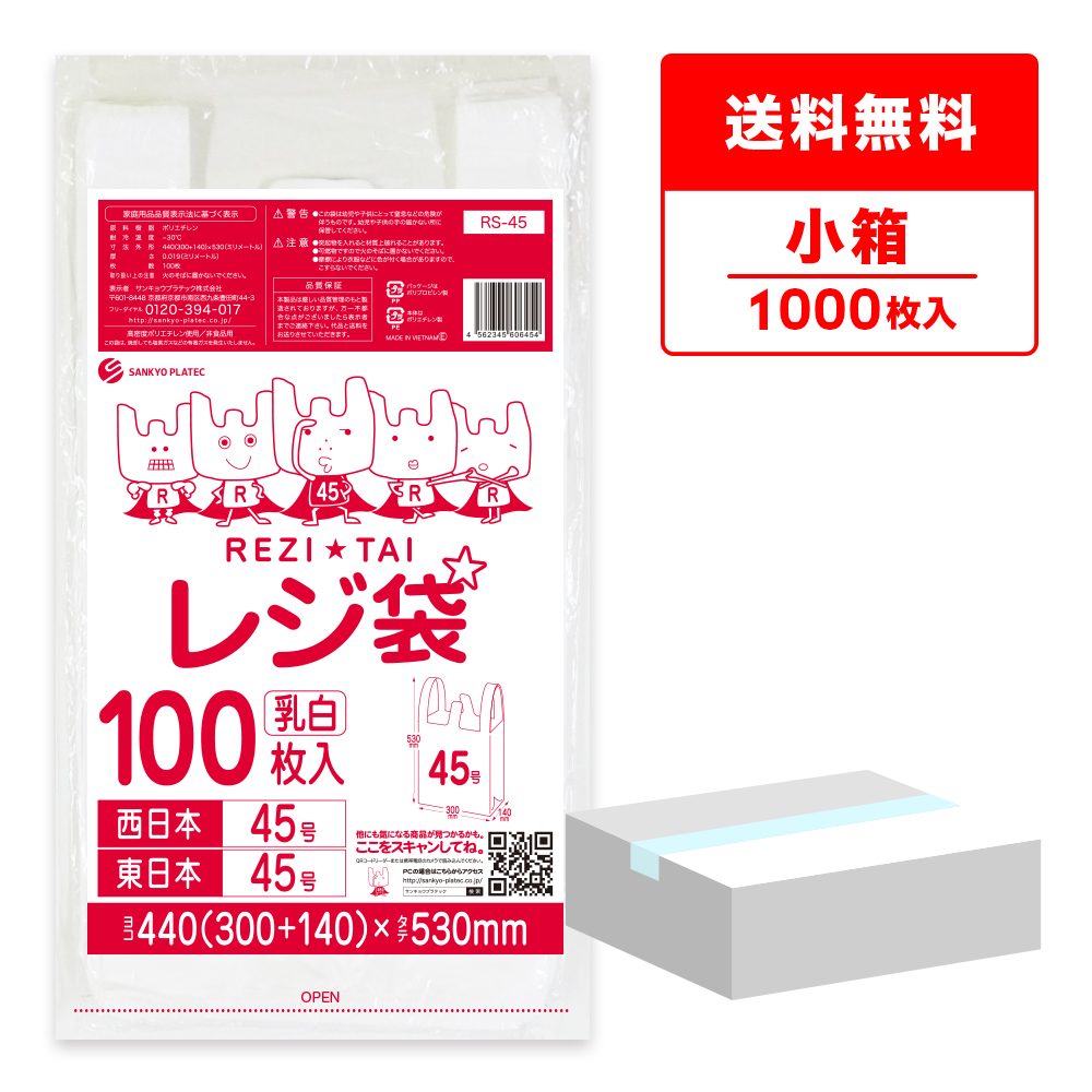 レジ袋 厚手 西日本 45号 (東日本45号) ブロック有 乳白 0.019mm厚 100枚x10冊 RS-45kobako/ 手さげ袋 買い物袋 袋 業務用 LL ホワイト 送料無料