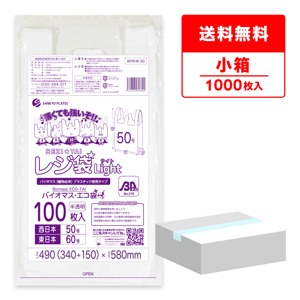 バイオマスプラスチック 25%配合 レジ袋 薄手 西日本 50号 (東日本60号) ブロック有 半透明 0.018mm厚 100枚x10冊 BPRHK-50kobako /手さげ袋 買い物袋 袋 3L 業務用 送料無料