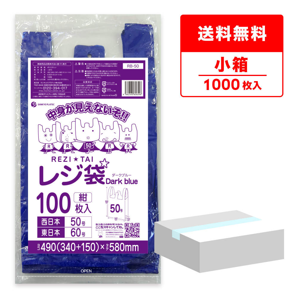 レジ袋 厚手 ダークブルー 西日本 50号 (東日本60号) ブロック有 紺 0.023mm厚 100枚x10冊 RB-50kobako /手さげ袋 買い物袋 袋 3L 業務用 送料無料