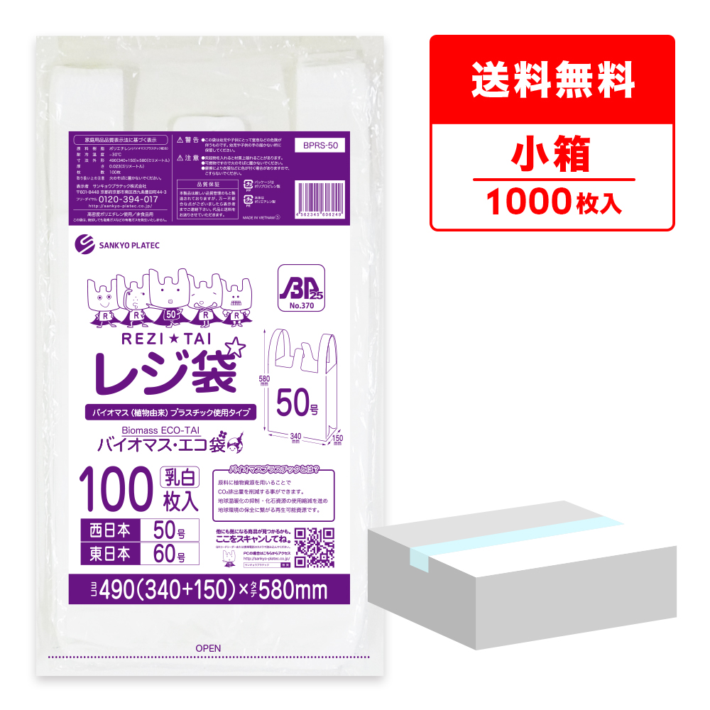 バイオマスプラスチック 25%配合 レジ袋 厚手 西日本 50号 (東日本60号) ブロック有 乳白 0.023mm厚 100枚x10冊 BPRS-50kobako /手さげ袋 買い物袋 袋 3L 業務用 送料無料